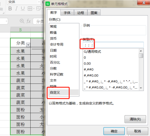 5、首先设置数字自定义通用格式修改为;;;
